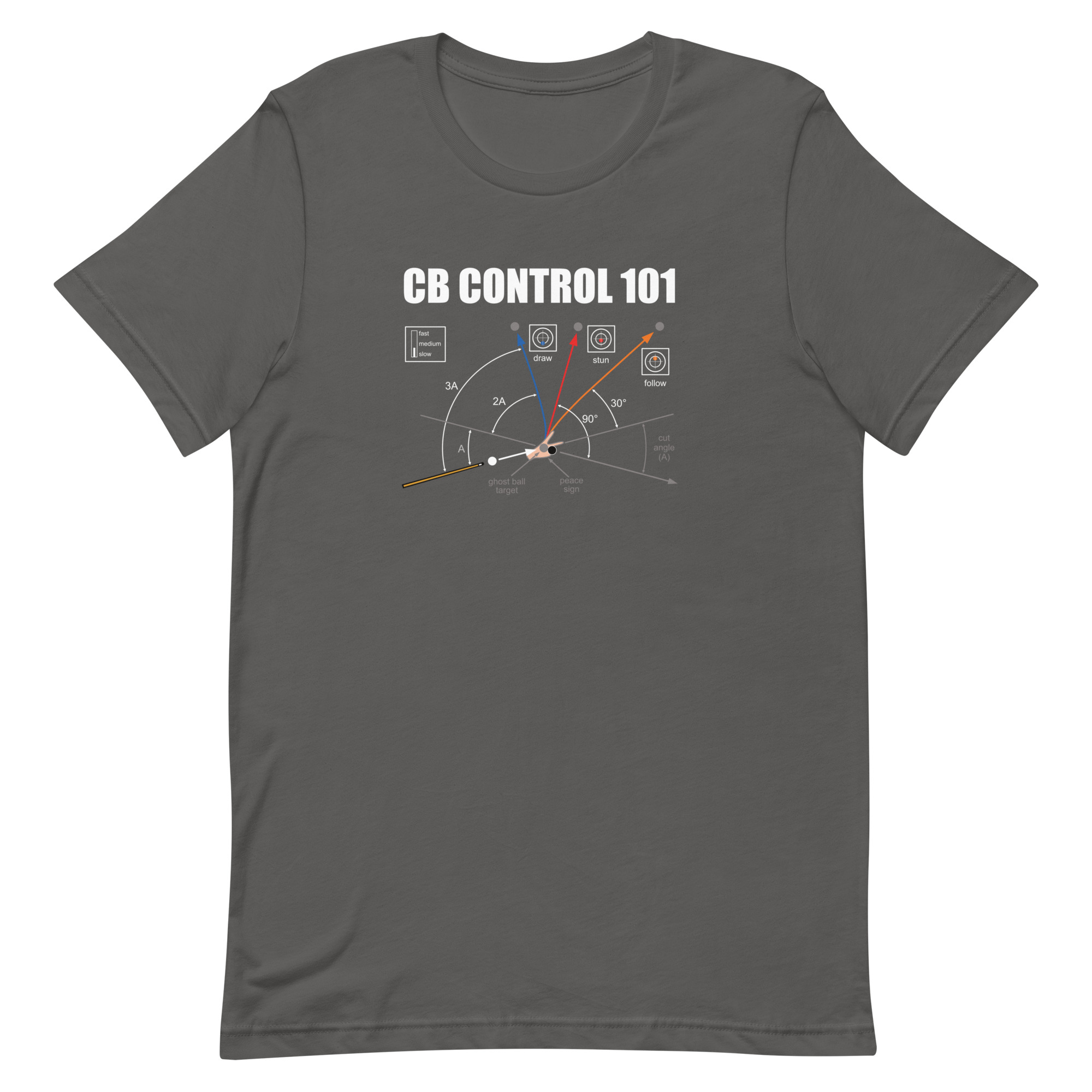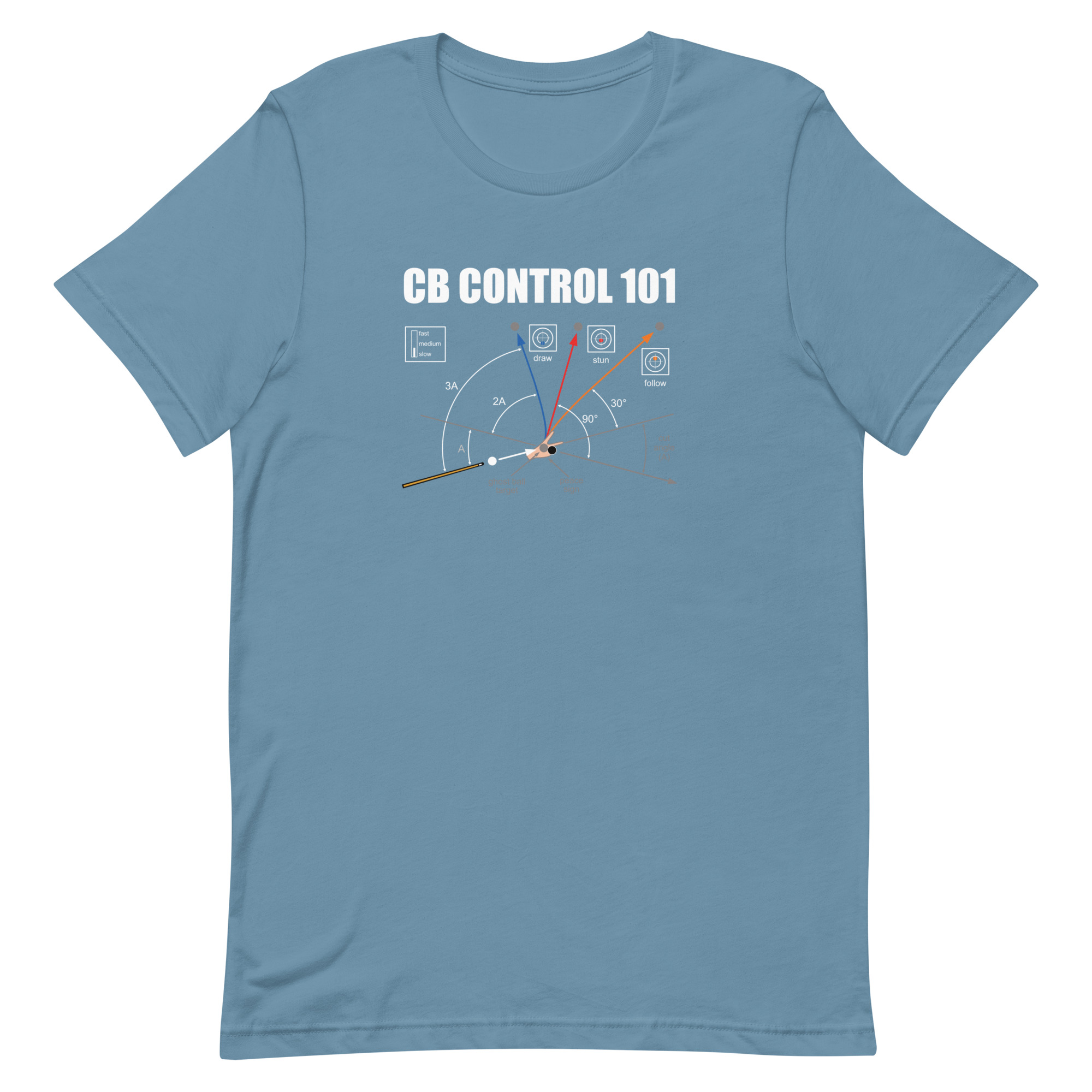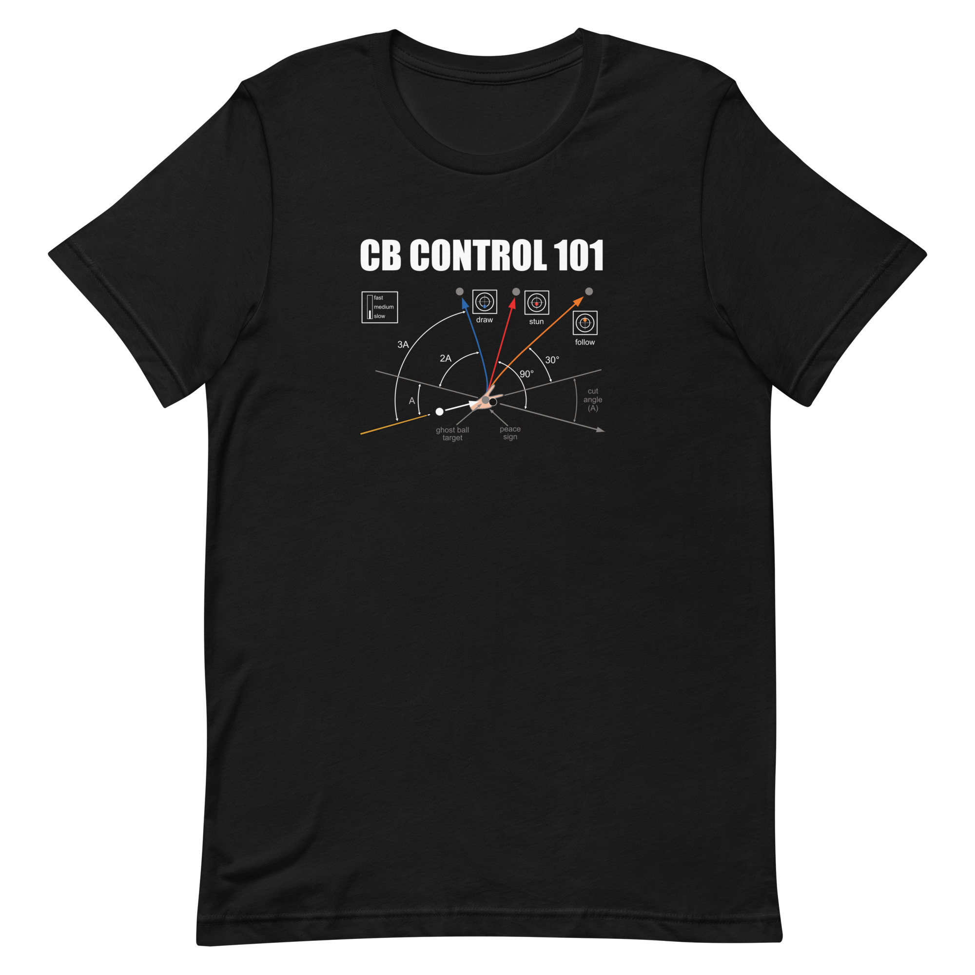 Pool and billiard T-shirt featuring an illustration of all important cue ball control principles including the 90-degree-rule tangent line, 30-degree-rule natural angle, and three-times-the-angle good-action draw direction.