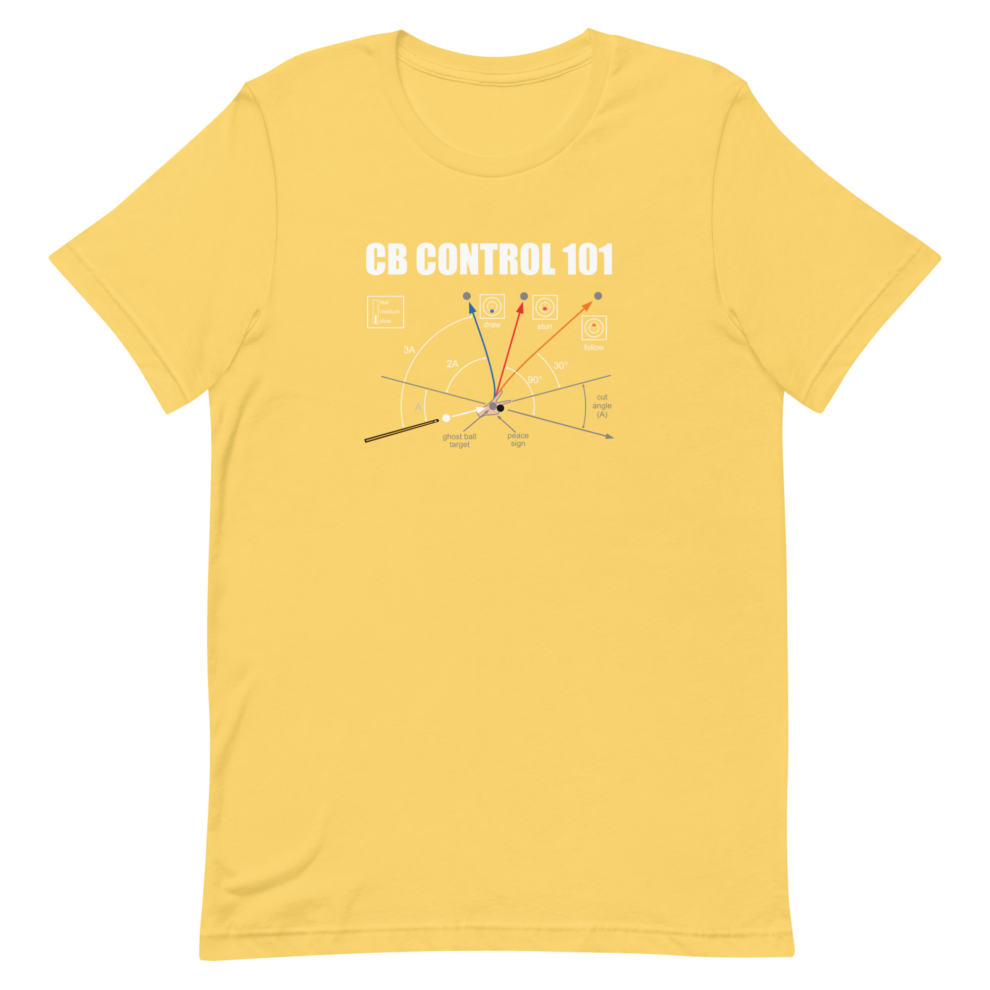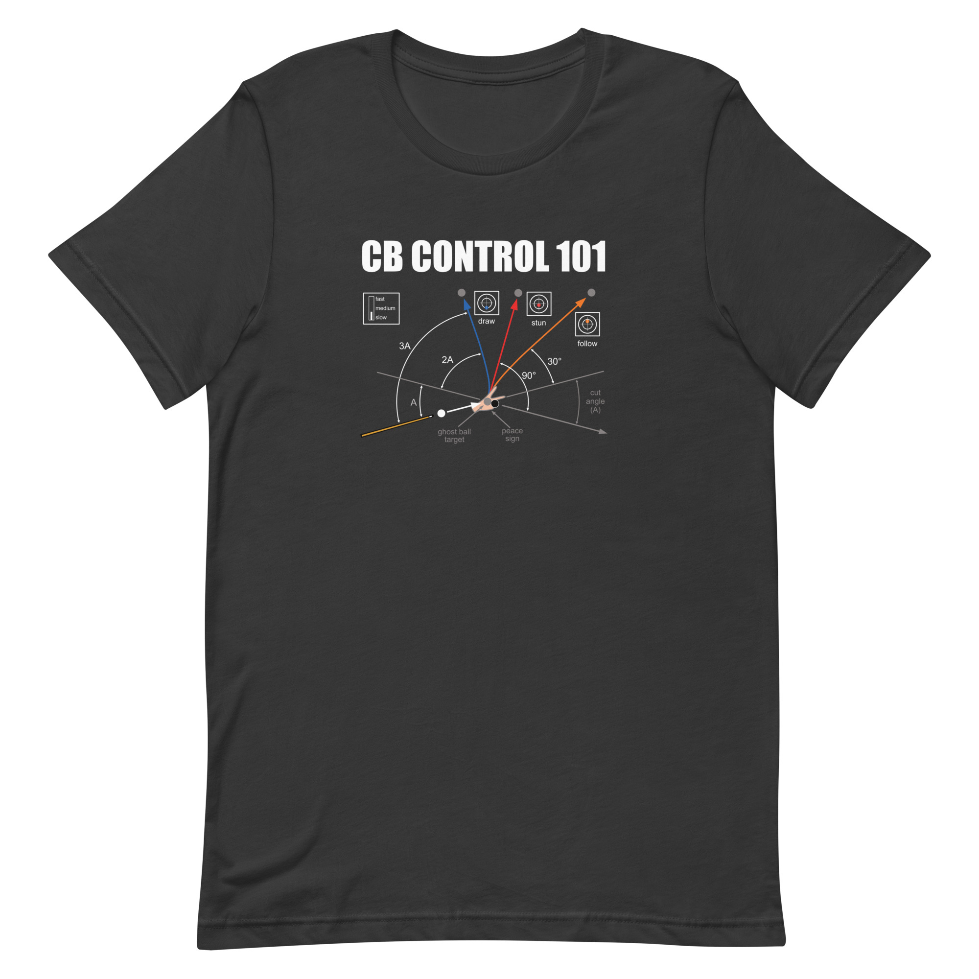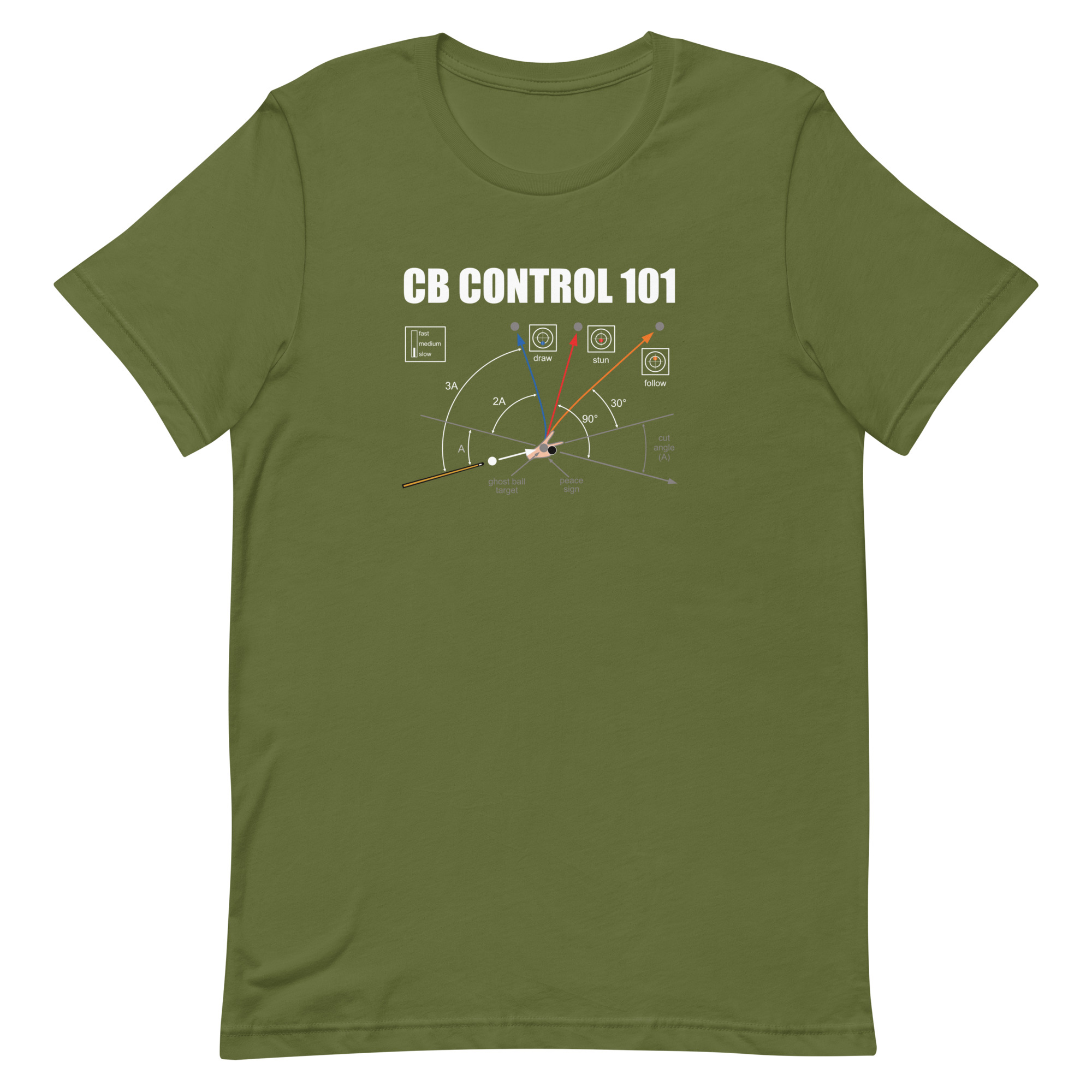 Pool and billiard T-shirt featuring an illustration of all important cue ball control principles including the 90-degree-rule tangent line, 30-degree-rule natural angle, and three-times-the-angle good-action draw direction.