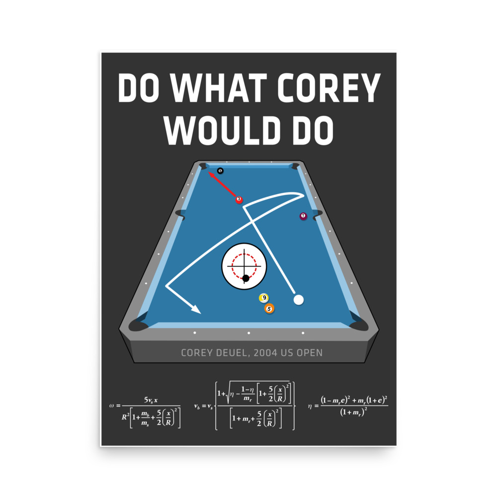 Pool and billiards poster featuring Corey Deuel’s famous power draw shot across the table along with the physics equations describing the shot.