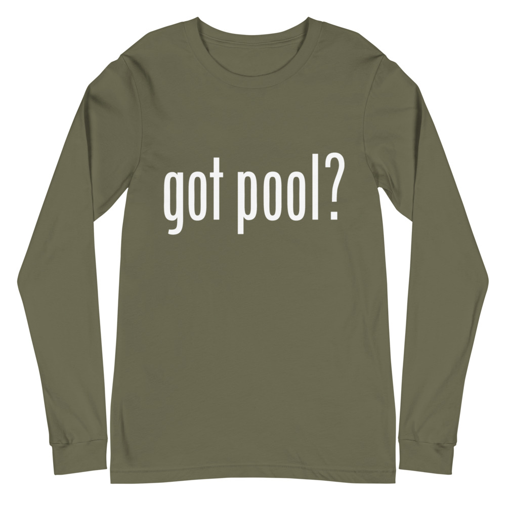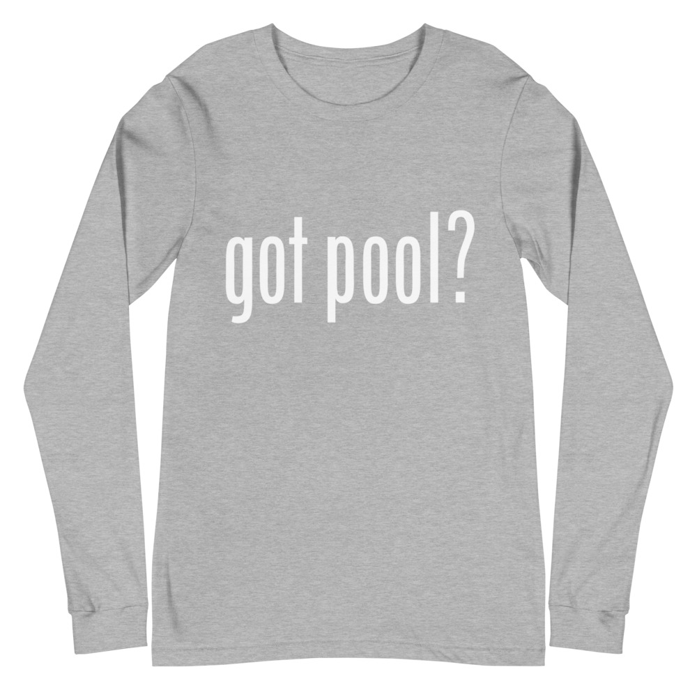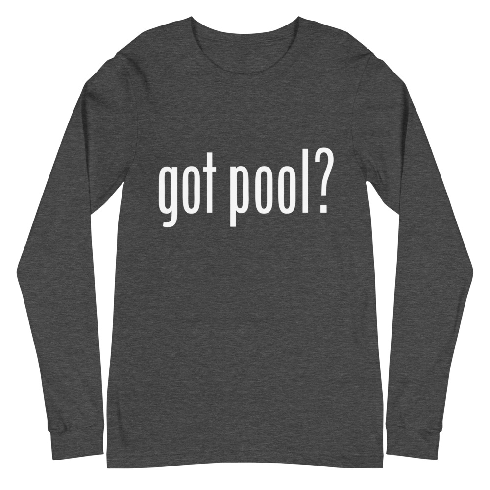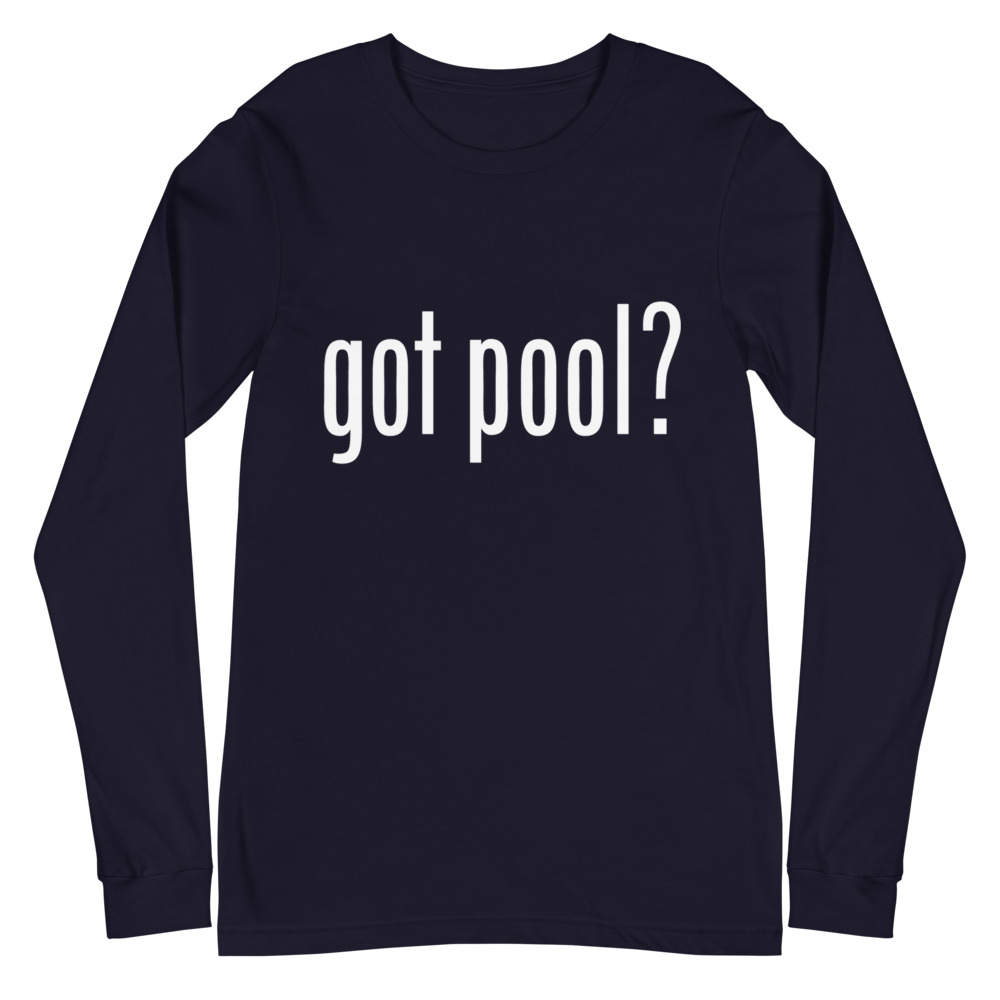 Pool and billiard long sleeve T-shirts featuring "Got Pool?" inspired by the famous "Got Milk?" saying.