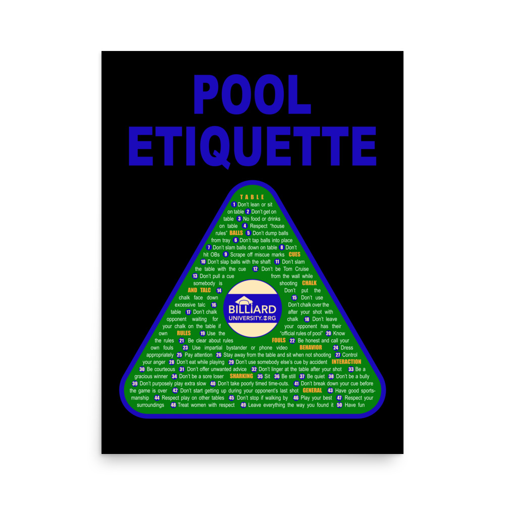Pool and billiards poster featuring the generally accepted but unofficial rules for how to behave properly at the pool table.